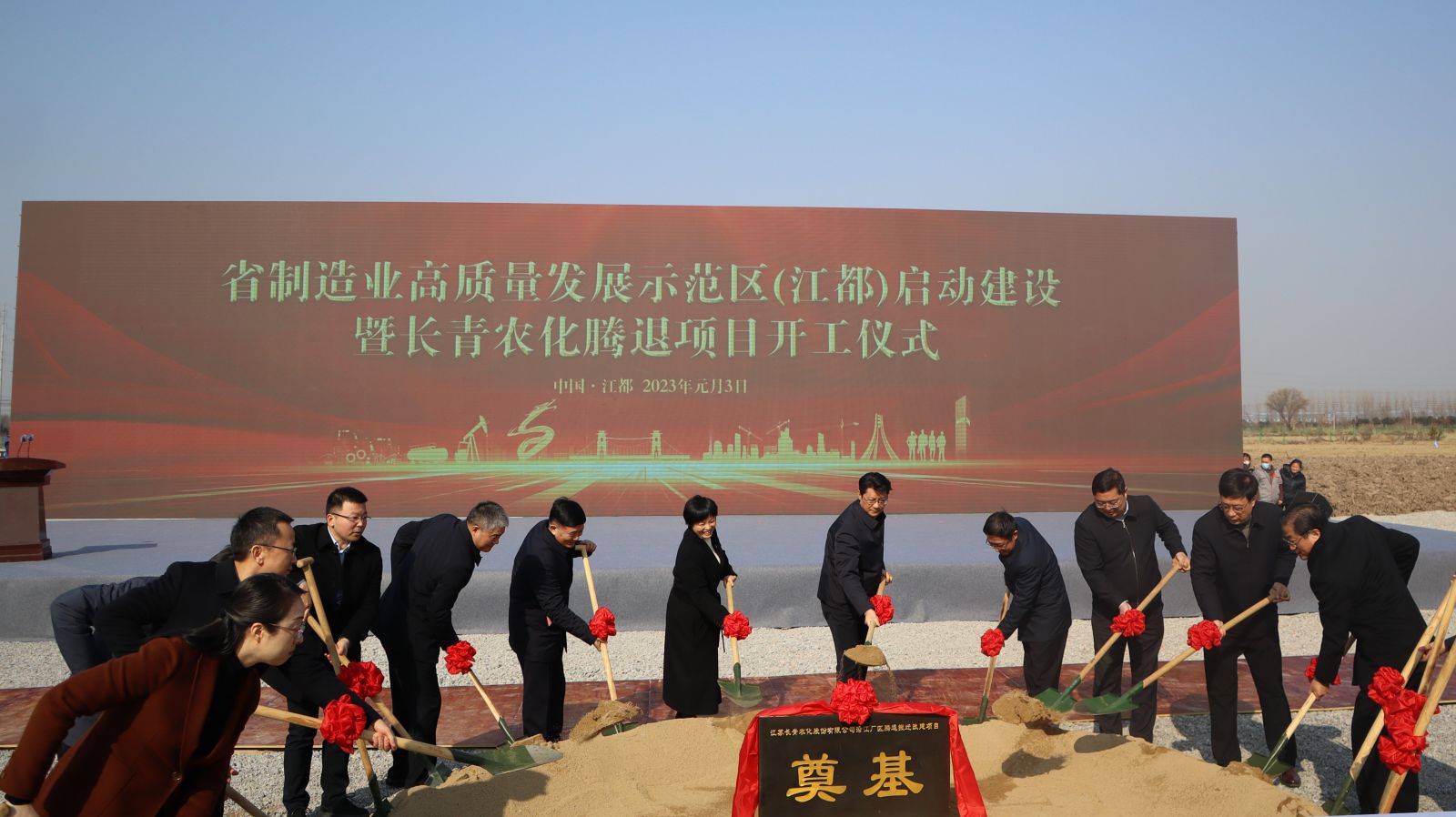 1月3日,江苏省制造业高质量发展示范区(江都)启动建设暨长青股份沿江厂区搬迁改建项目奠基仪式正式举行。扬州市委副书记、市长王进健,副市长汤卫华,市政府秘书长徐志刚,市政府副秘书长刘卫清,市工信局党组副书记、副局长钱峰,市工信局副局长赵宽安,江都区委书记朱莉莉,区委副书记、区长朱定金,区人大常委会主任王正年,区政协主席曾庆玲,区委副书记、副区长周磊,区委副书记葛智勇,常务副区长杜辉,副区长徐晖等市、区及相关部门、镇(园区)领导参加本次仪式。